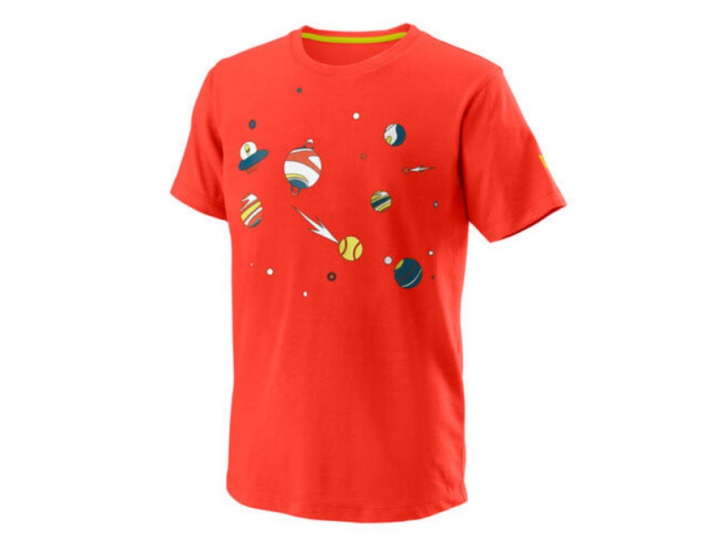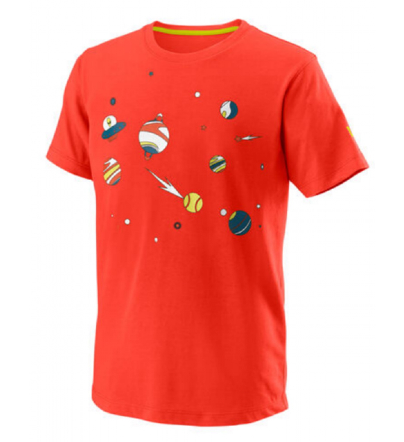 Chlapčenské tričko Wilson Planetary Tech Tee B s krátkym rukávom vyzerá skvele, je veľmi príjemné na dotyk aj nosenie a má na hrudi originálnu grafiku. Poskytuje maximálny komfort pri tenisovom tréningu alebo zápase. Tričko je vhodné na tenis, bedminton či squash.